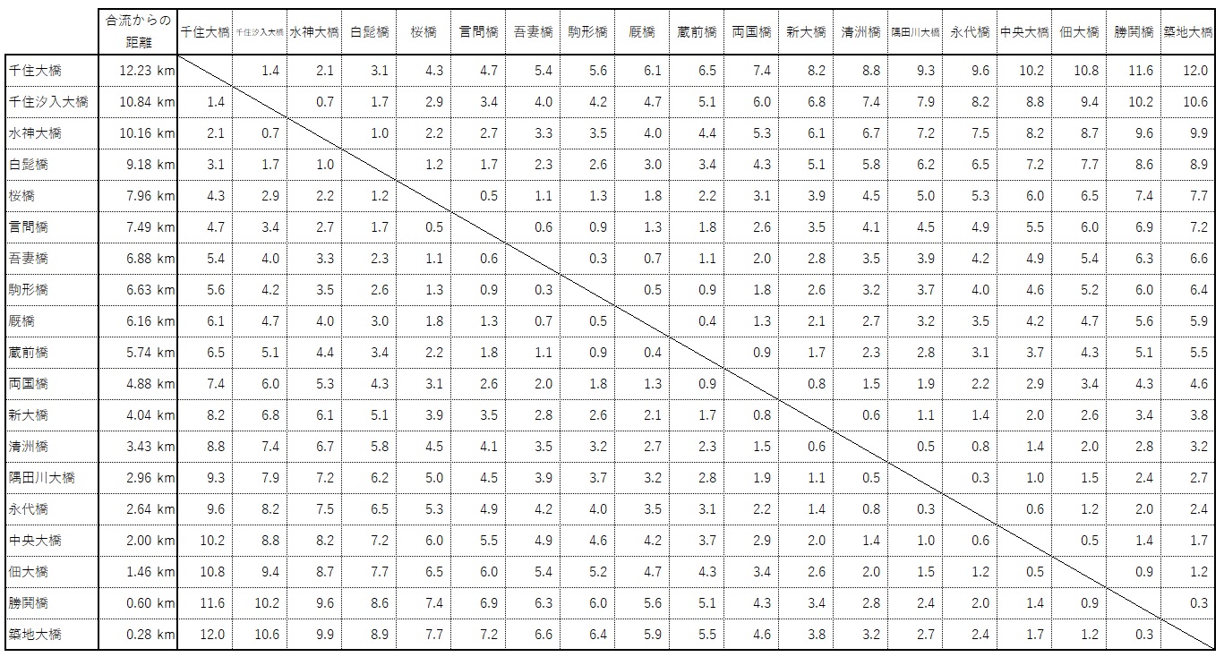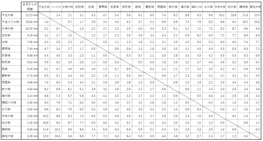 千住大橋から築地大橋までの間に架かる橋について、橋と橋の距離を表にまとめました。